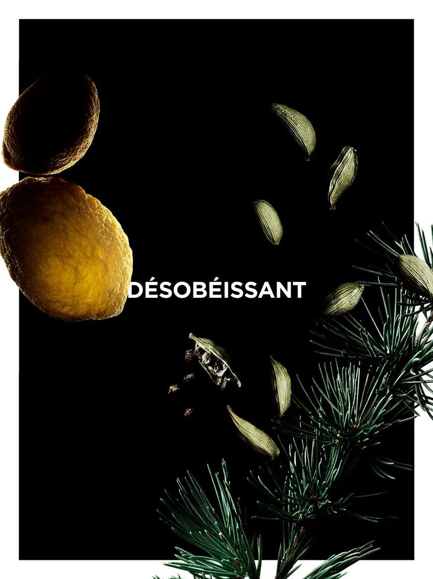 Désobéissant opens with a lively burst of sparkling cedrat, leading into an intriguing heart where smoky black tea and warm cardamom interplay for a sophisticated contrast. The base of sylvester pine lends rich, woody depth, creating a long‑lasting signature that’s both fresh and bold — perfect for the modern individual who embraces confidence and individuality.